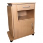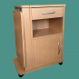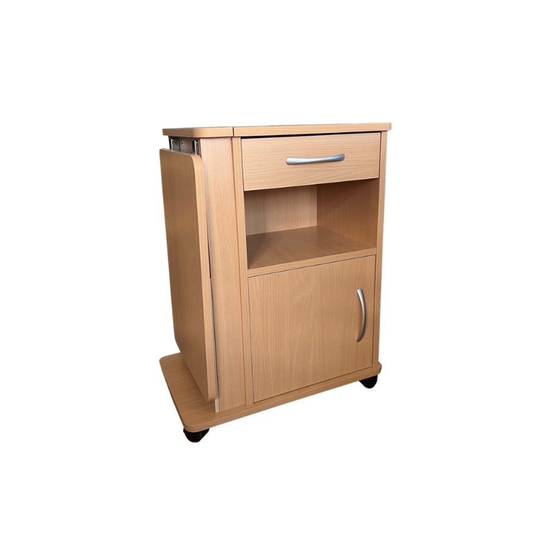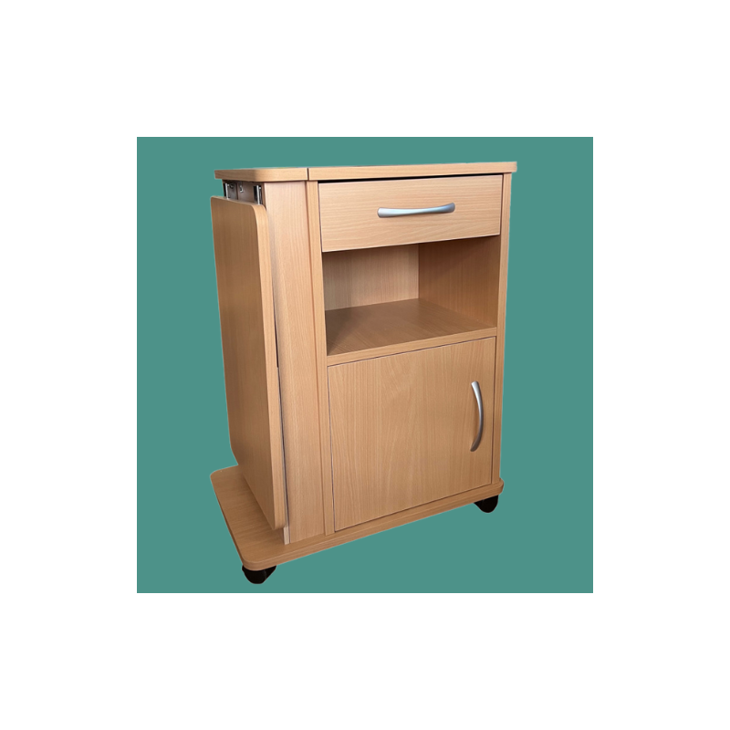Mesita de noche fabricado configurada con cajón, hueco y puerta, ligera y transportable gracias a sus ruedas. Opción de quitar el atril (consultar precio).